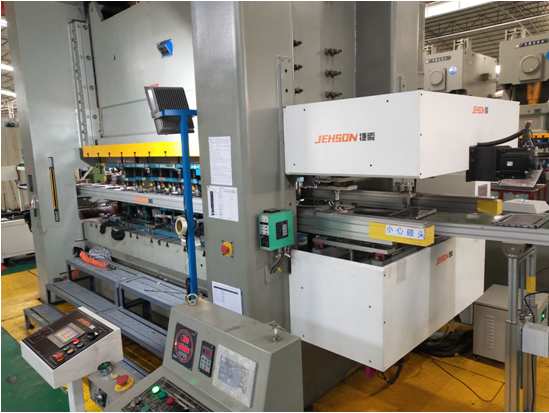 機器人代替人工搬運,給沖床上下料,本項目采用7臺捷瞬四軸擺臂沖壓機器人+1條左右產品碼垛定位輸送機+1個左右二次定位臺,在原有產線實現無縫對接,滿足節(jié)拍要求,最終達到每分鐘約12-14次,同時實現固定軌億一沖二整個沖壓工序,同時節(jié)省6-8名人工,整線僅需1人看護。